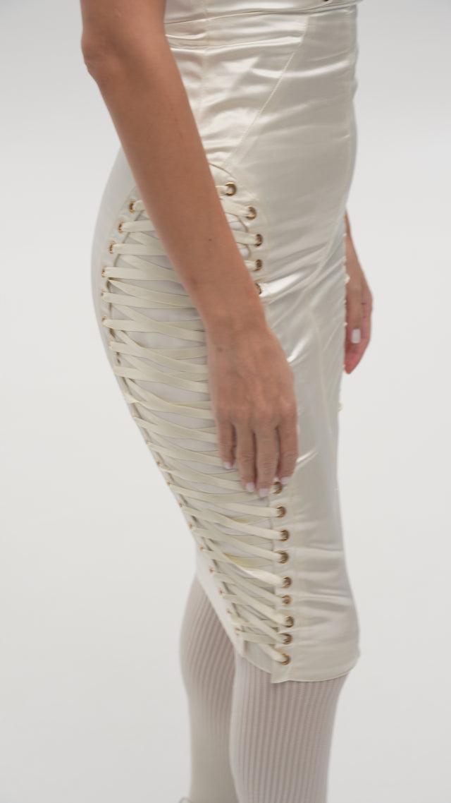 The Monaco dress is a symbol of confidence, romance and individuality, thought out to the smallest detail. The champagne color is ideal for all colours types. Draped cups and grommets in the form of a corset emphasize all feminine beauty, ideal for all events.