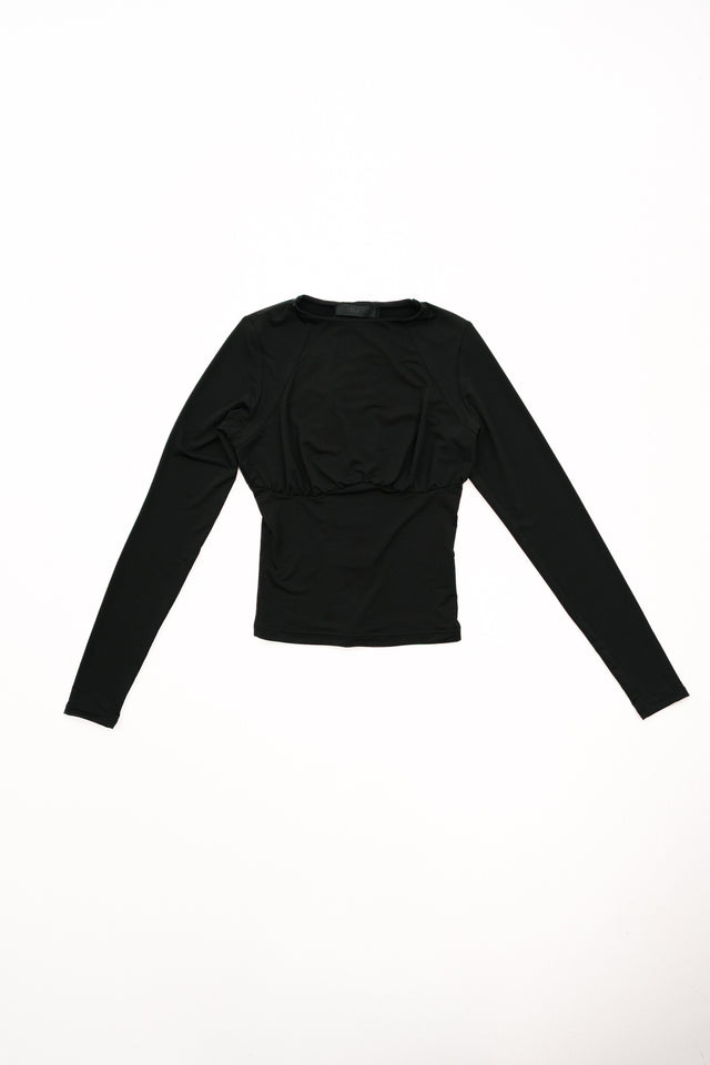 The fitted silhouette highlights your shape, while the subtle gathering at the chest adds a touch of uniqueness. Long sleeves and a classic crew neckline make this top perfect for daily outfits or active days. The back weave with eyelets and lace adds uniqueness to what is not just a basic item.